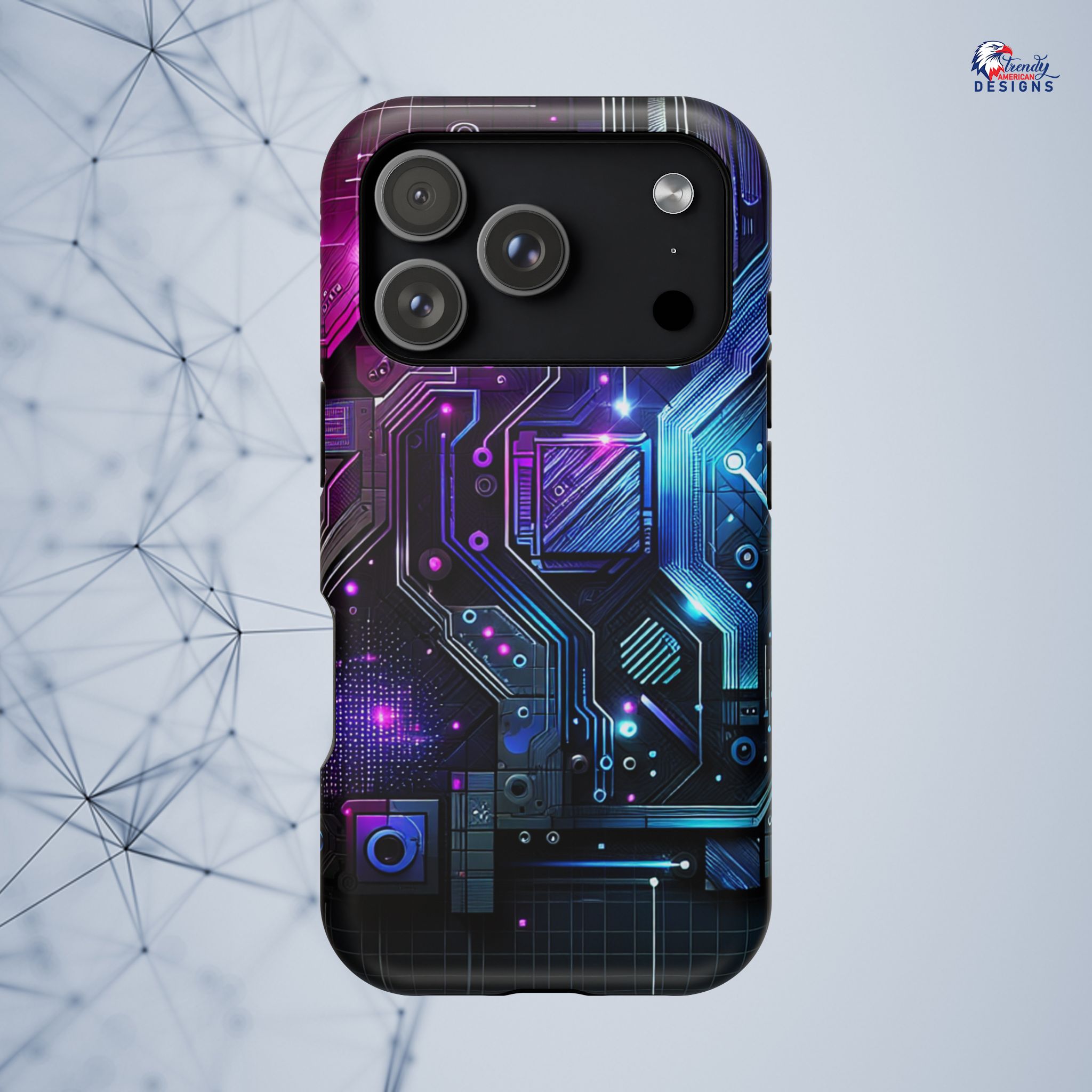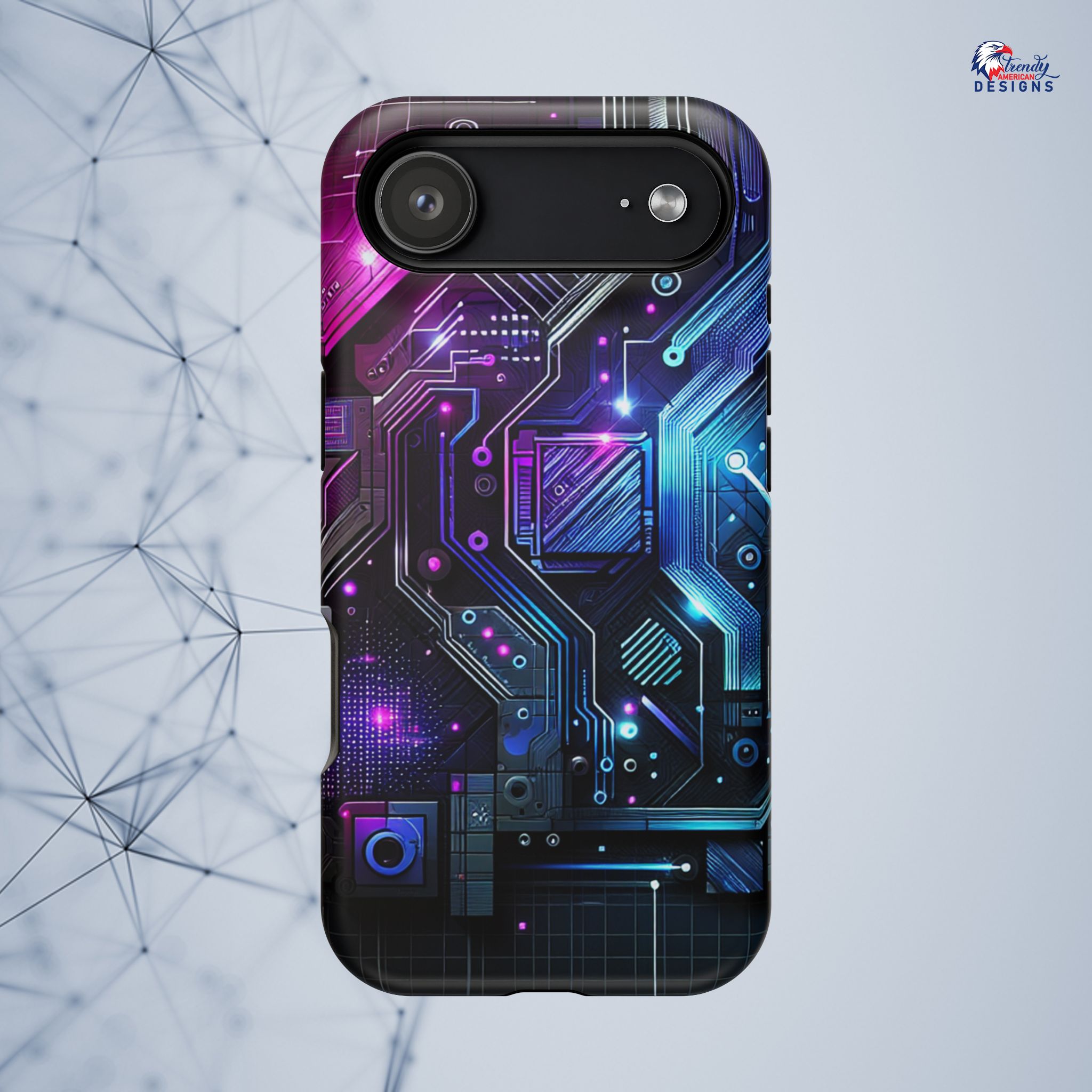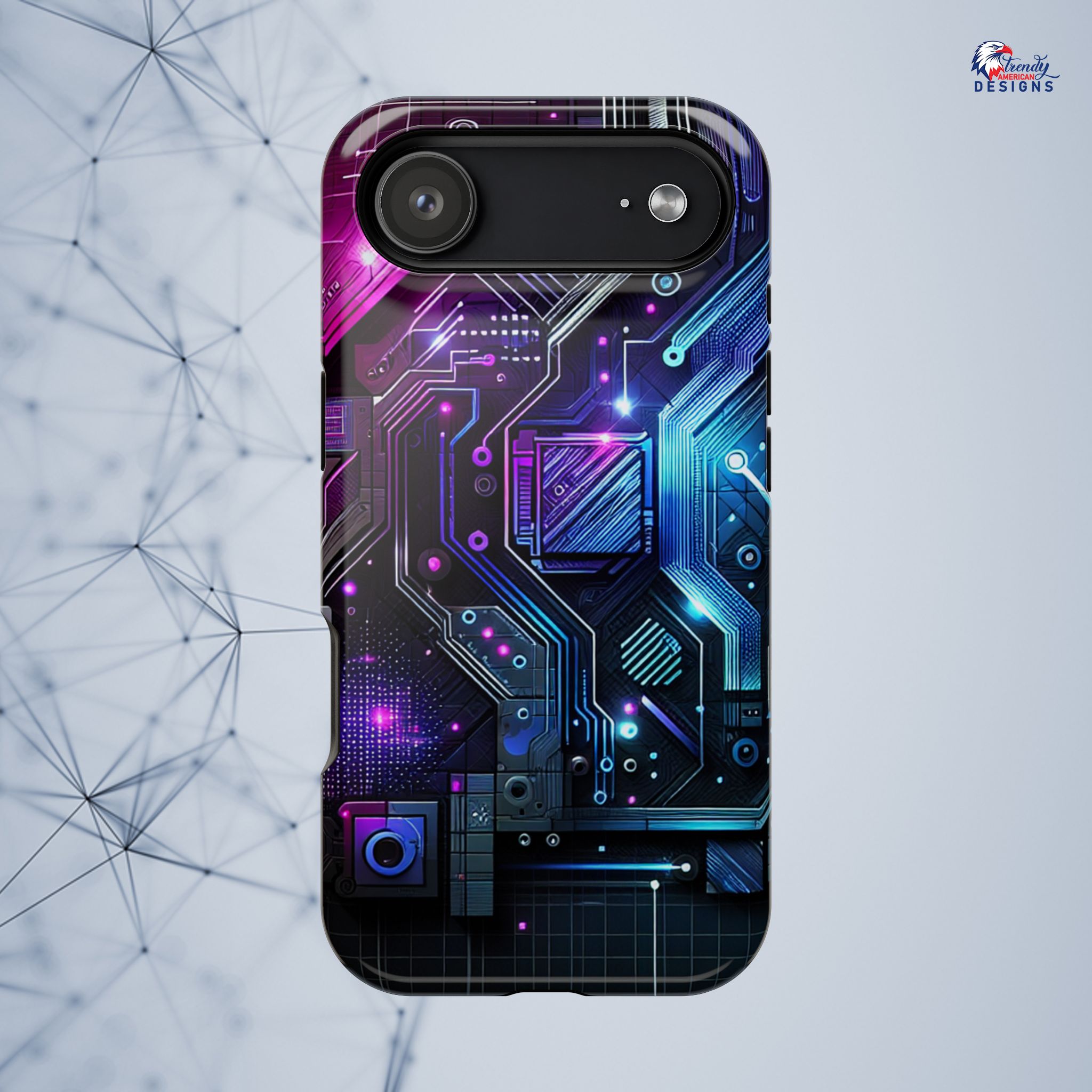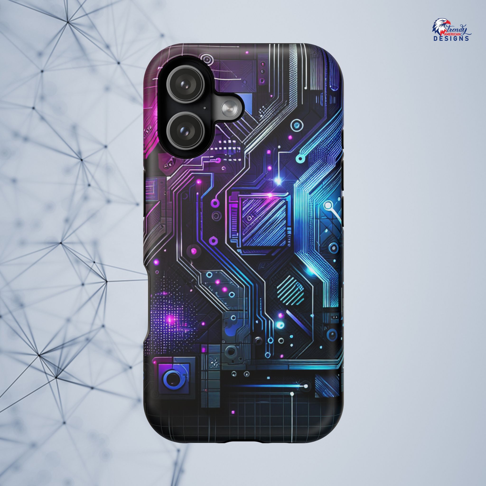 This protective phone case brings a pulse of neon circuitry to your everyday carry. The full-wrap, photo-realistic print blends electric blues, purples, and magentas into a futuristic motherboard motif that feels at home with tech setups, gaming desks, and late-night code sessions. Built as a dual-layer shell with a cushioned TPU interior, it absorbs shocks and resists scratches while keeping a sleek profile. Embedded magnets enable MagSafe-style attachment and the glossy or matte finish options let you pick the sheen that matches your rig. Slip it on and your phone reads like part of your gear—bold, engineered, and ready for whatever your day (or night) throws at it.