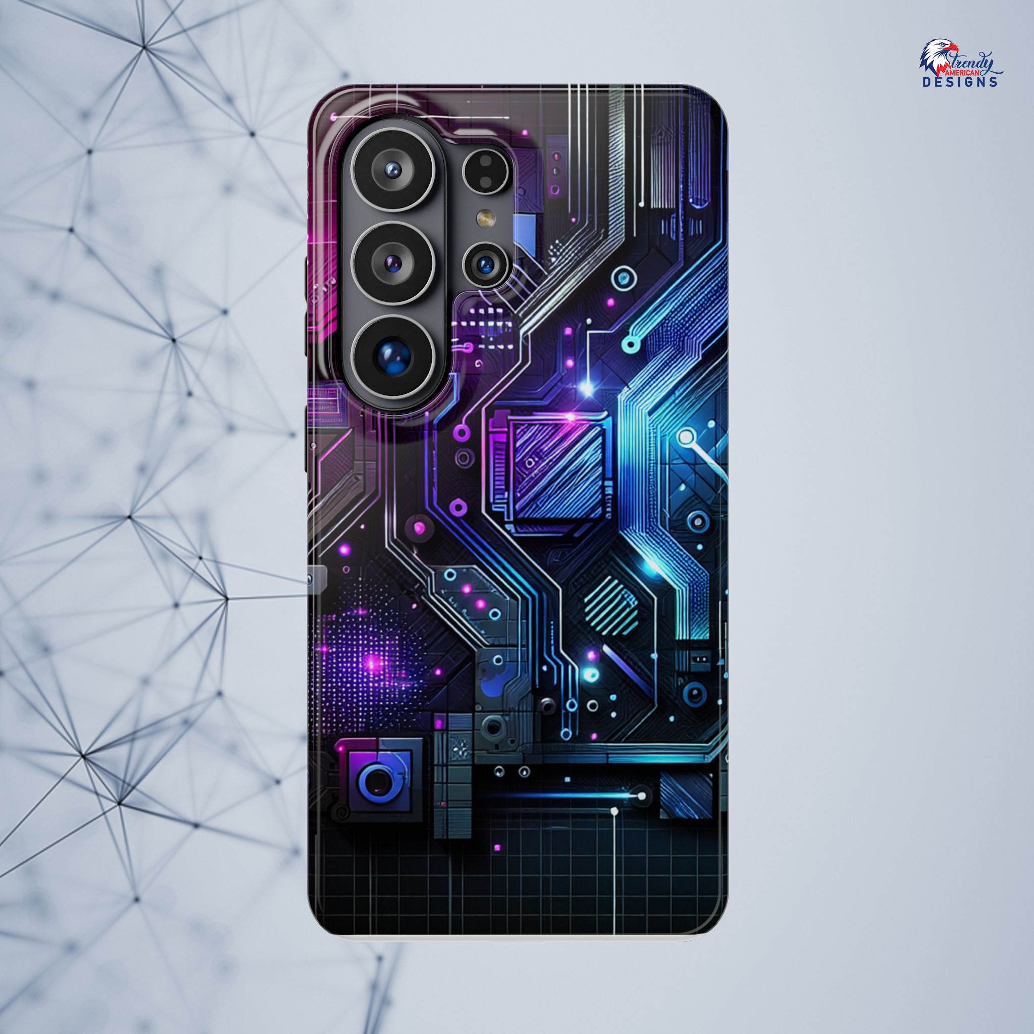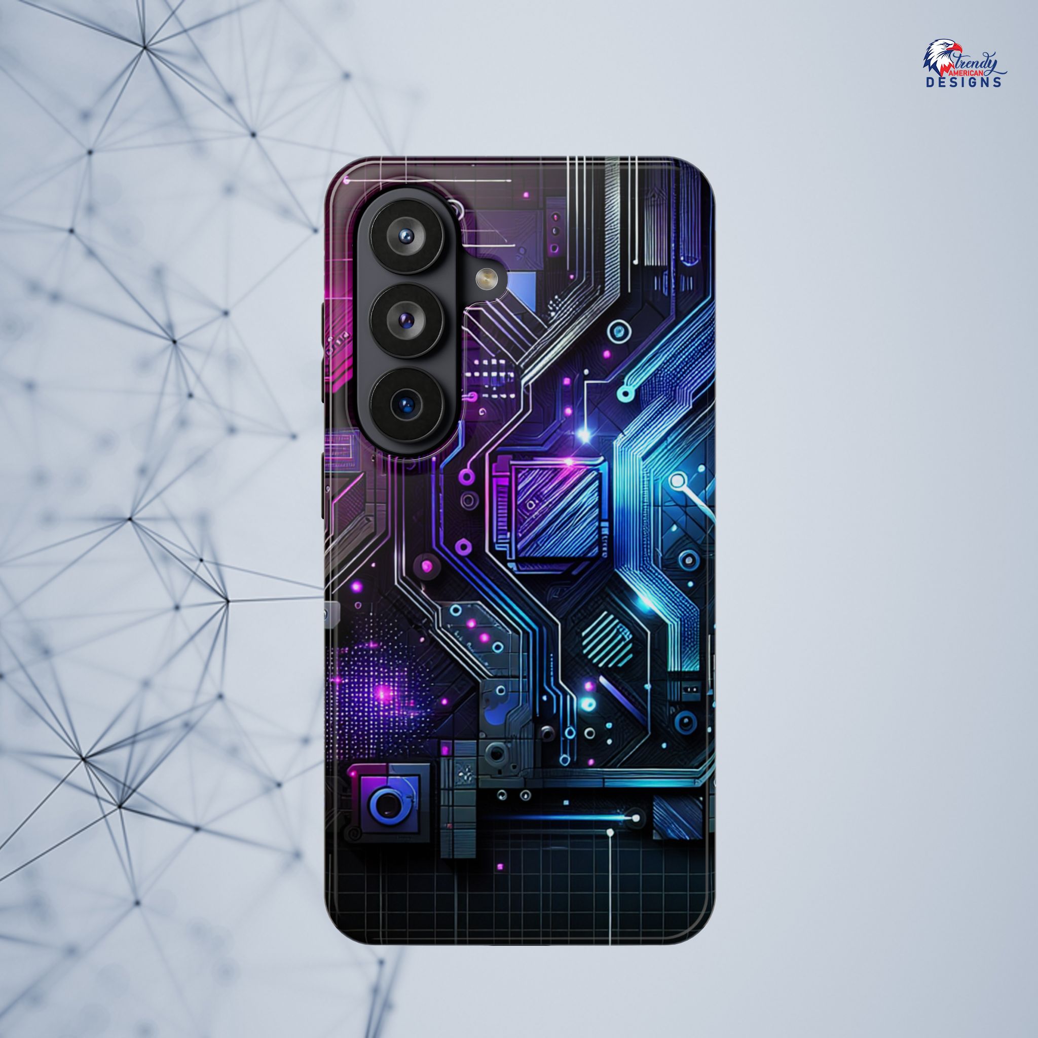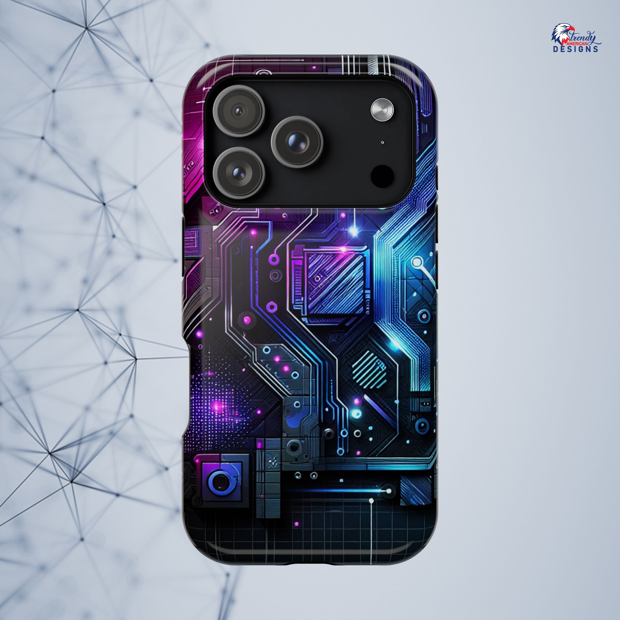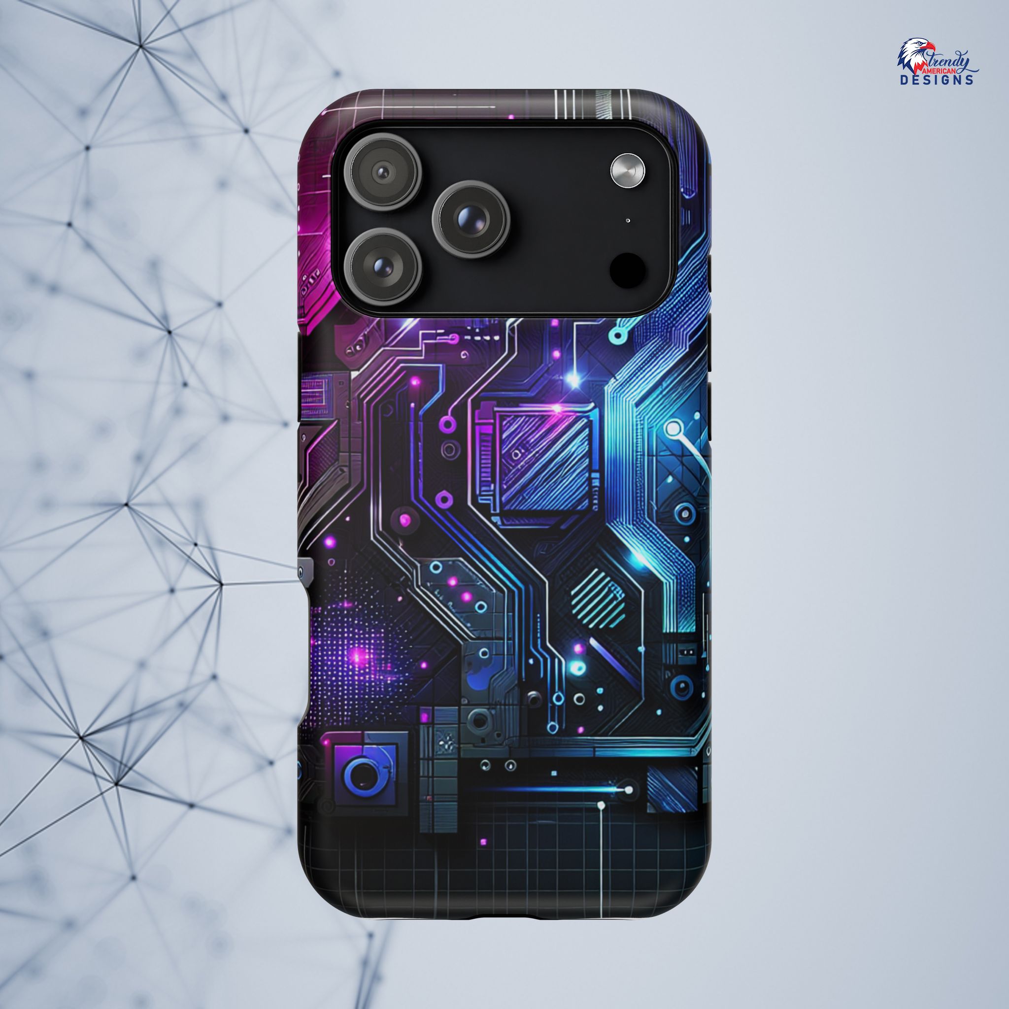 This protective phone case brings a pulse of neon circuitry to your everyday carry. The full-wrap, photo-realistic print blends electric blues, purples, and magentas into a futuristic motherboard motif that feels at home with tech setups, gaming desks, and late-night code sessions. Built as a dual-layer shell with a cushioned TPU interior, it absorbs shocks and resists scratches while keeping a sleek profile. Embedded magnets enable MagSafe-style attachment and the glossy or matte finish options let you pick the sheen that matches your rig. Slip it on and your phone reads like part of your gear—bold, engineered, and ready for whatever your day (or night) throws at it.