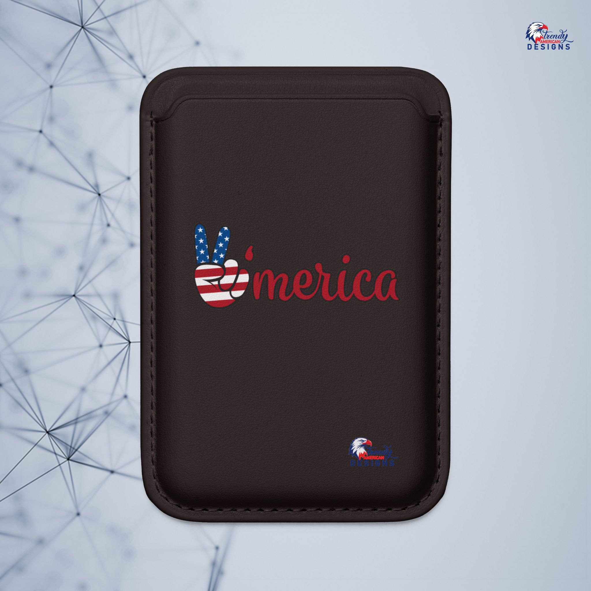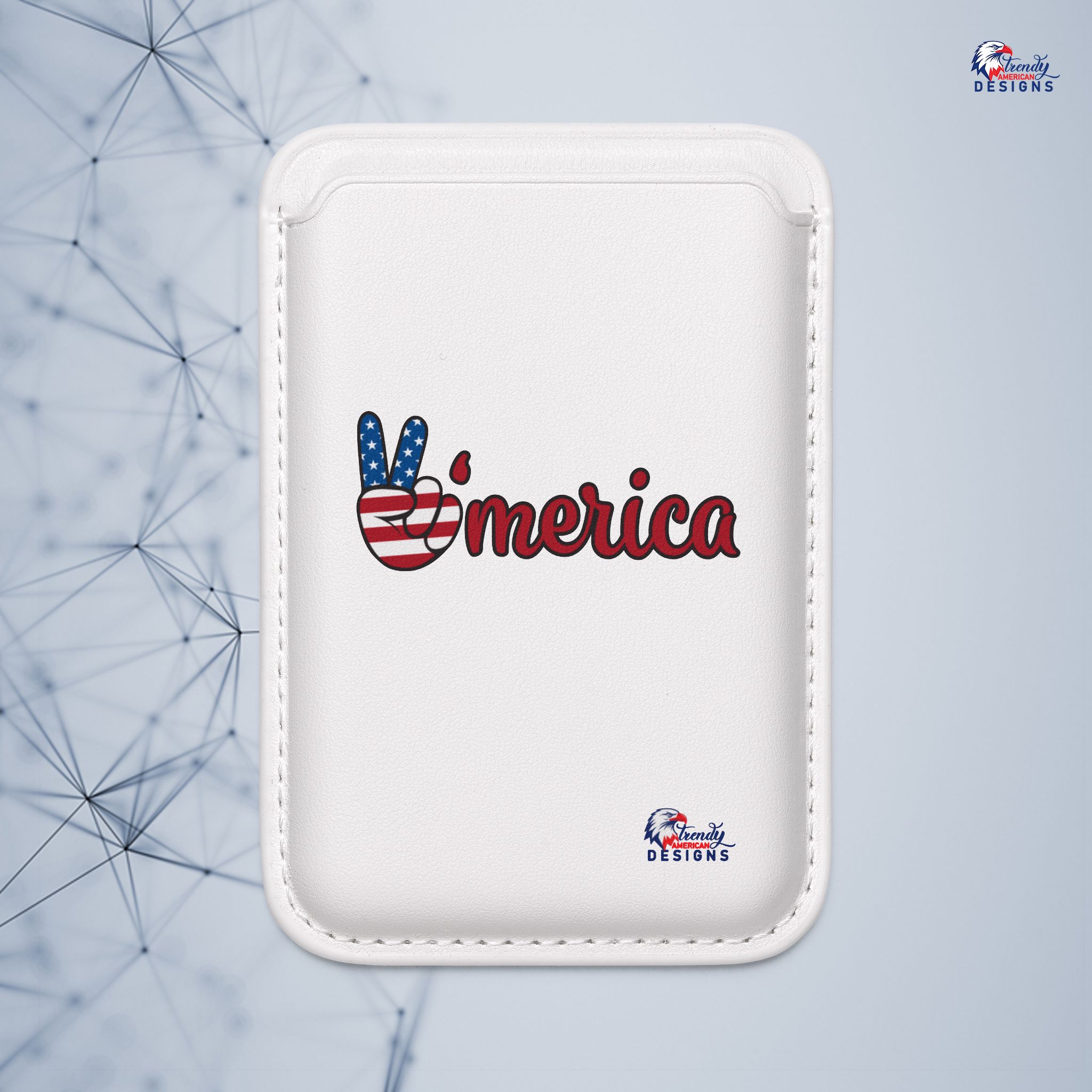 A slim, vegan PU leather MagSafe wallet that adds a dash of playful patriotism to your everyday carry. The front shows a bright, crisp printed design with a hand-sign ’V’ rendered in Stars-and-Stripes pattern and matching script — cheerful and unmistakable on either a white or black vegan leather base. It snaps to MagSafe-compatible phones with a quick-release magnet and holds up to two cards securely while keeping your device pocketable and light. The soft, slightly padded exterior protects against scratches while the low-profile silhouette slides easily into a jacket or jeans pocket. This wallet is for people who like functional minimalism with personality — for weekend parades, summer cookouts, or the everyday commute when you want your essentials close and your style turned up.